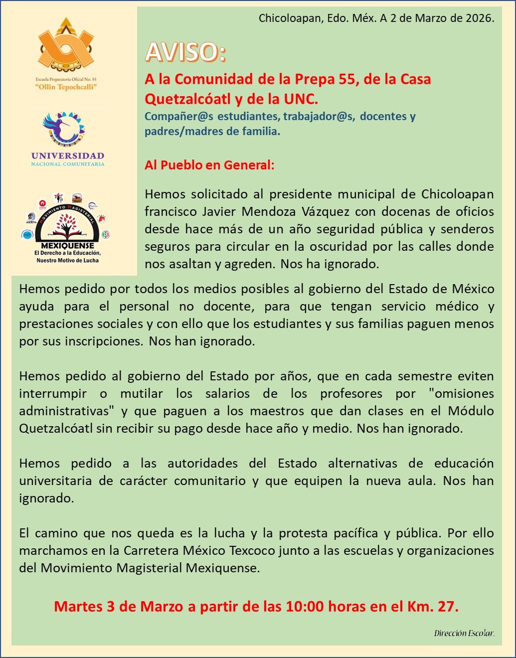 Marchamos junto a las escuelas y organizaciones del Movimiento Magisterial Mexiquense